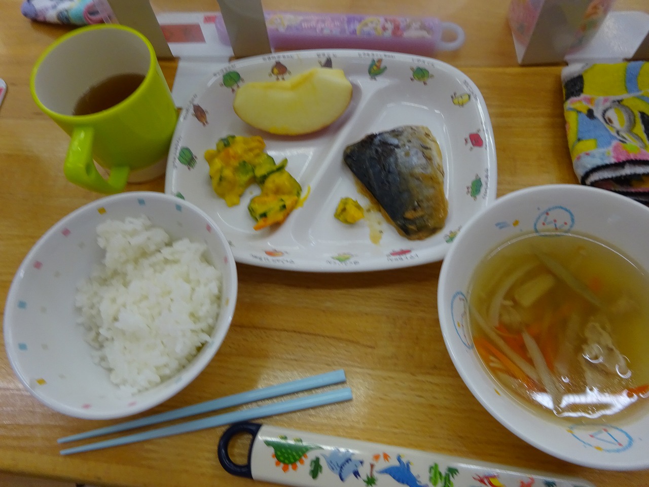 12月7日(水)給食 ・ごはん ・さばのみぞれ煮 ・かぼちゃサラダ(かぼちゃ・きゅうり・にんじん・コーン・マヨドレ) ・沢煮腕(豚肉・だいこん・にんじん・ごぼう・えのきたけ・ねぎ) ・りんご
