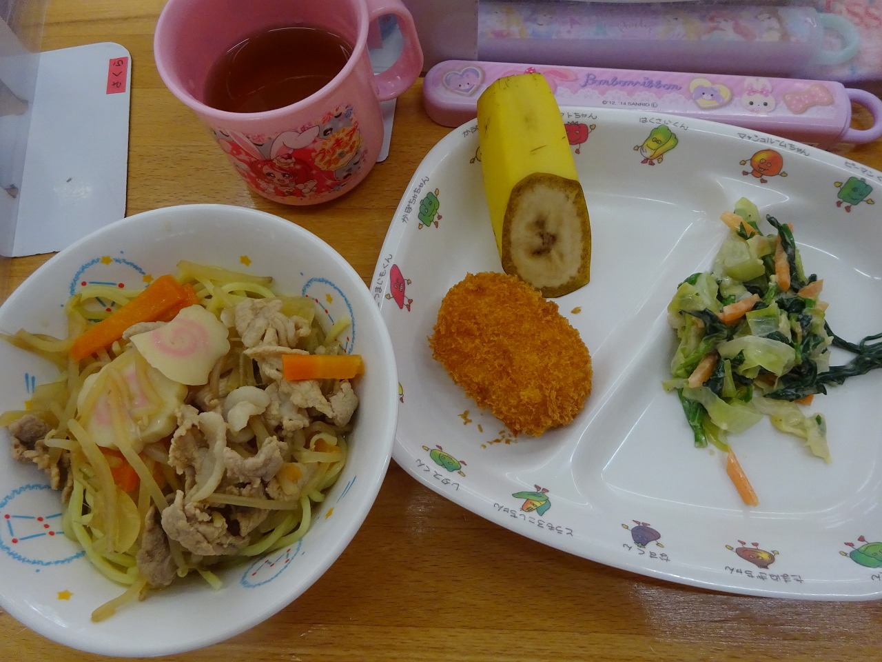 12月8日(木)給食 ・みそラーメン(麺・豚肉・なると・玉ねぎ・にんじん・もやし・みそ) ・ほうれん草ごまドレ(ほうれん草・キャベツ・にんじん・ごま) ・ミニ野菜コロッケ ・バナナ