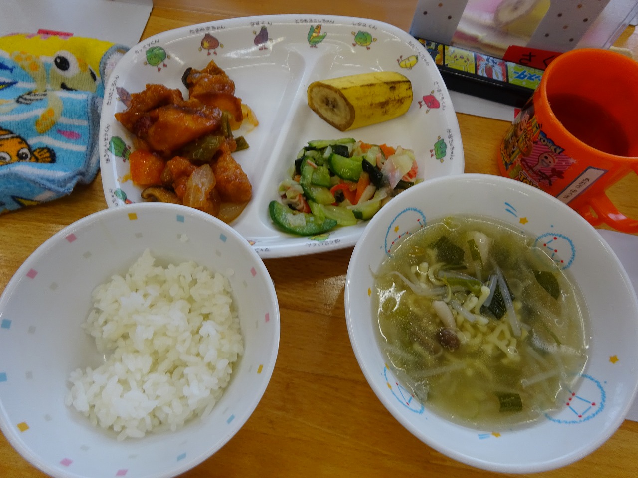 9月1日(木)給食 ・ごはん ・酢豚(豚肉・さつまいも・にんじん・玉ねぎ・ピーマン) ・かいそうサラダ(海草・キャベツ・きゅうり・にんじん・かにかま) ・ABCスープ(マカロニ・チンゲン菜・もやし・しめじ・ねぎ) ・バナナ