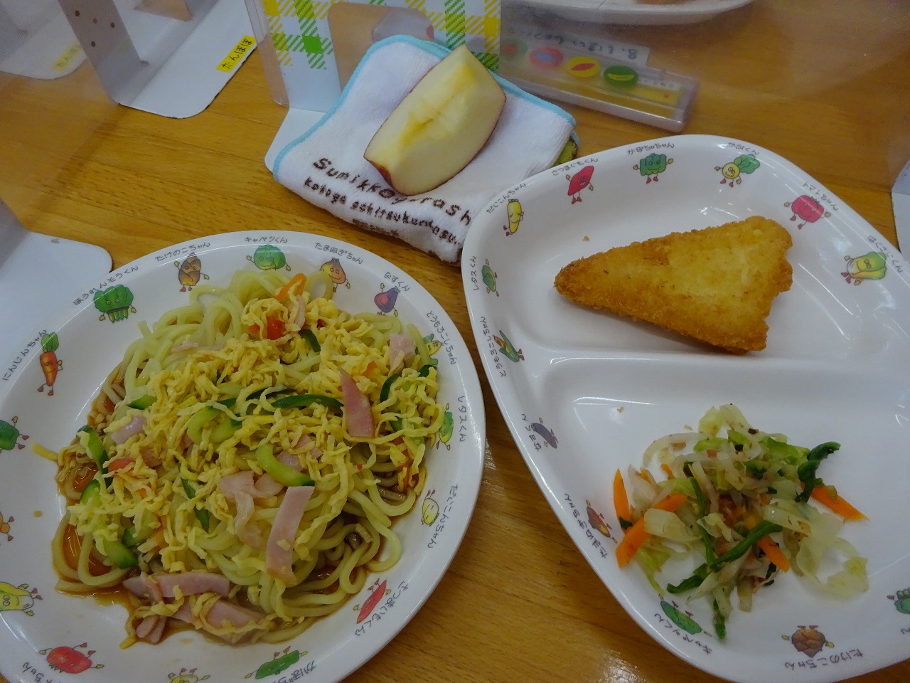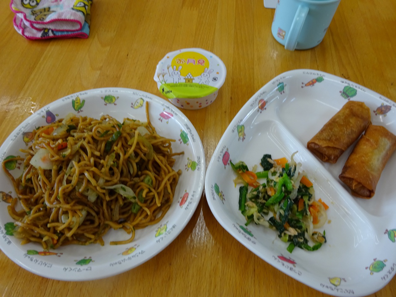 9月9日(金)給食 ・焼きそば(麺・豚肉・キャベツ・玉ねぎ・にんじん・ピーマン) ・小松菜のツナあえ(こまつな・きゅうり・もやし・にんじん・ツナ) ・ミニはるまき ・お月見デザート