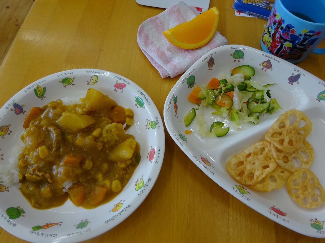 9月5日(月)給食 ・カレーライス(米・豚肉・じゃがいも・玉ねぎ・にんじん・ピーマン) ・ブロッコリーサラダ(ブロッコリー・キャベツ・きゅうり・にんじん) ・れんこんチップス ・オレンジ