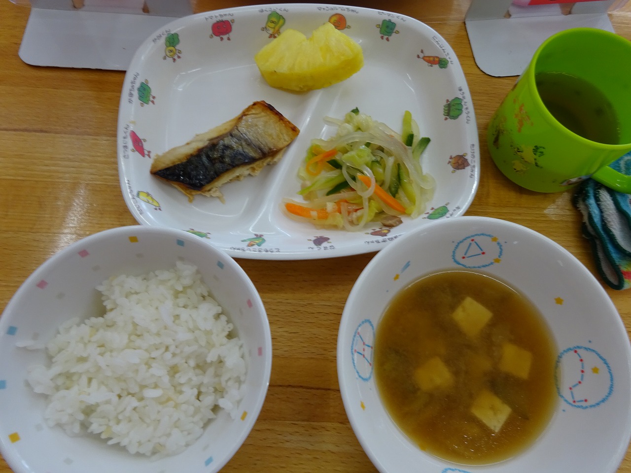 9月8日(木)給食 ・ごはん ・さばの照り焼き ・バンサンスー(マロニー・キャベツ・きゅうり・にんじん・ハム) ・みそ汁(豆腐・油揚げ・なす・玉ねぎ・しいたけ・みそ) ・パイナップル