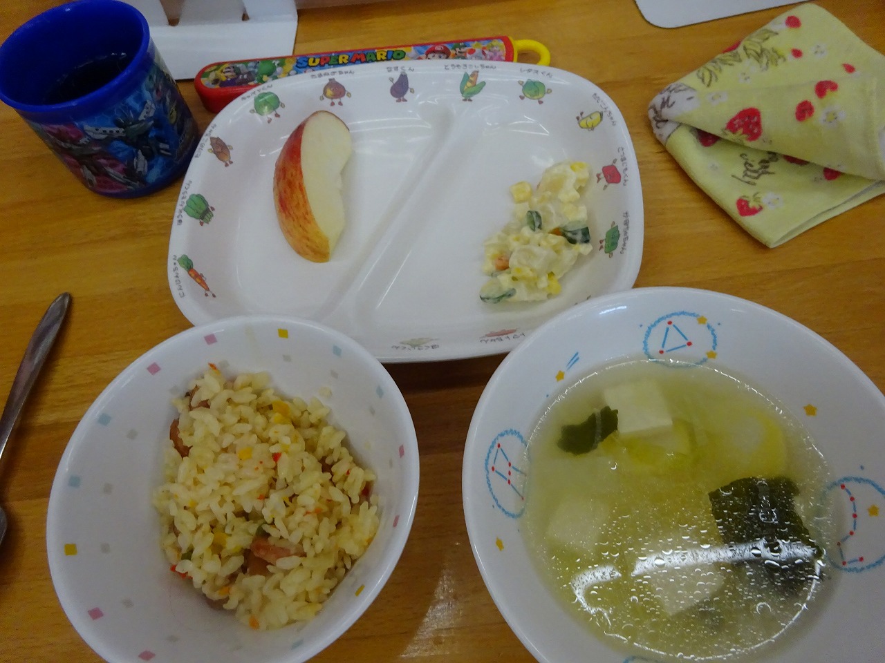 9月12日(月)給食 ・カラフルチャーハン(米・ウインナー・玉ねぎ・にんじん・パプリカ・ピーマン) ・マセドアンサラダ(じゃがいも・きゅうり・にんじん・コーン・マヨドレ) ・わかめスープ(わかめ・豆腐・かまぼこ・キャベツ・ねぎ) ・りんご