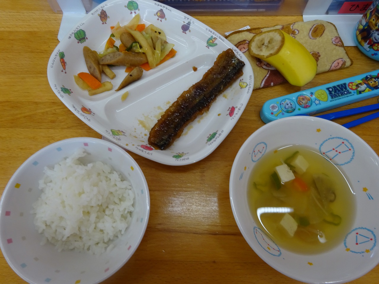 9月13日(火)給食 ・ごはん ・さんまの蒲焼き ・いろどりソテー(ウインナー・キャベツ・にんじん・玉ねぎ・ピーマン・ポテト) ・五目汁(豆腐・だいこん・にんじん・ごぼう・ねぎ) ・バナナ
