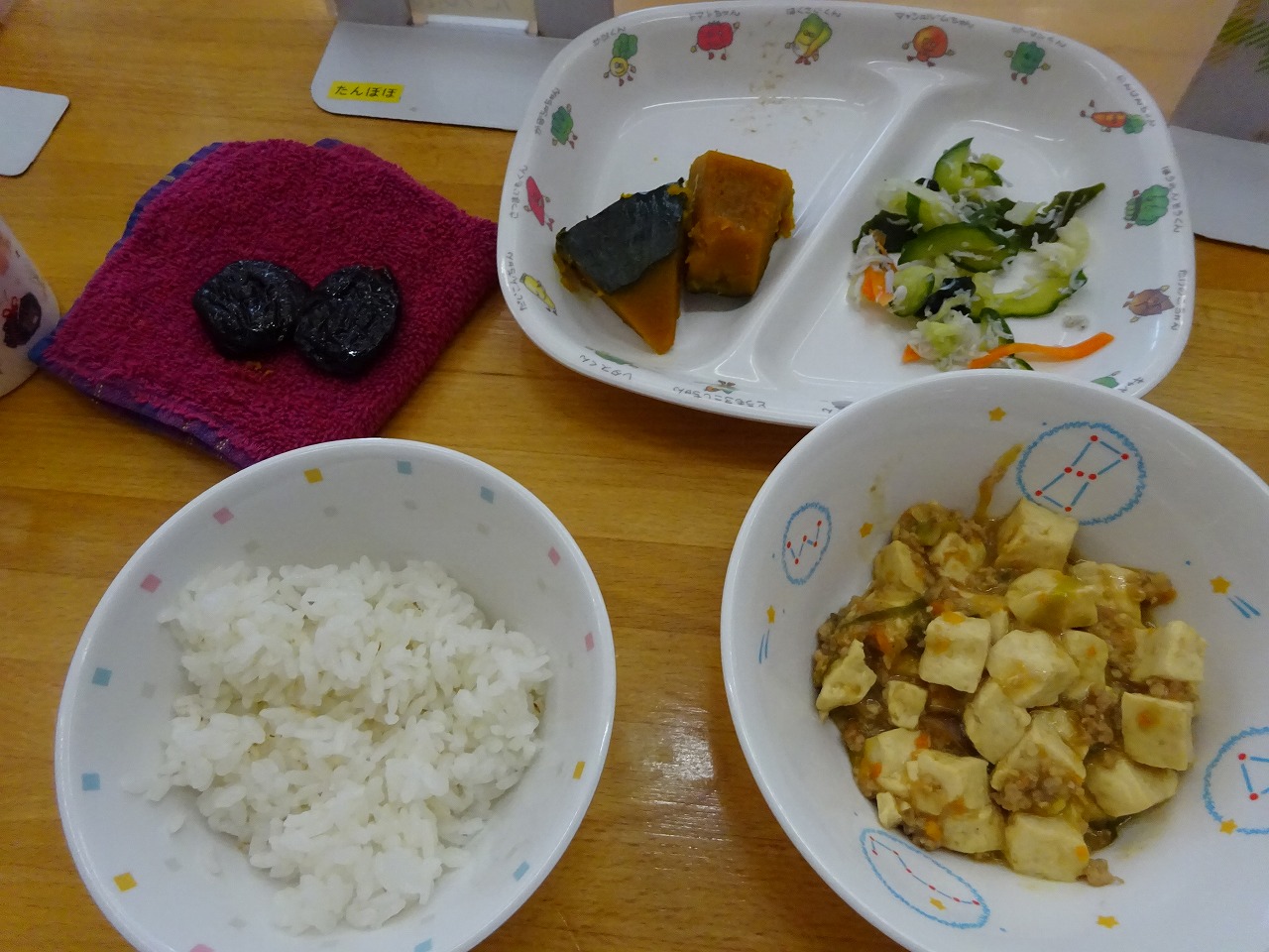 9月14日(水)給食 ・ごはん ・マーボー豆腐(豆腐・豚ひき肉・ねぎ・にんじん・干ししいたけ) ・甘酢あえ(キャベツ・きゅうり・にんじん・しらす干し・わかめ) ・かぼちゃ甘煮 ・プルーン
