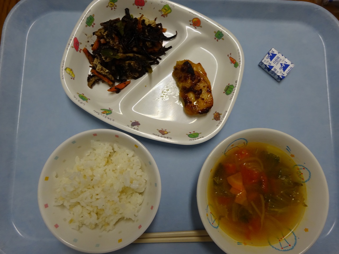 9月16日(金)給食 ・ごはん ・鶏肉のカレー焼き ・ひじきの煮物(ひじき・油揚げ・ちくわ・にんじん・いんげん) ・トマトスープ(トマト・レタス・玉ねぎ・もやし・にんじん) ・チーズ