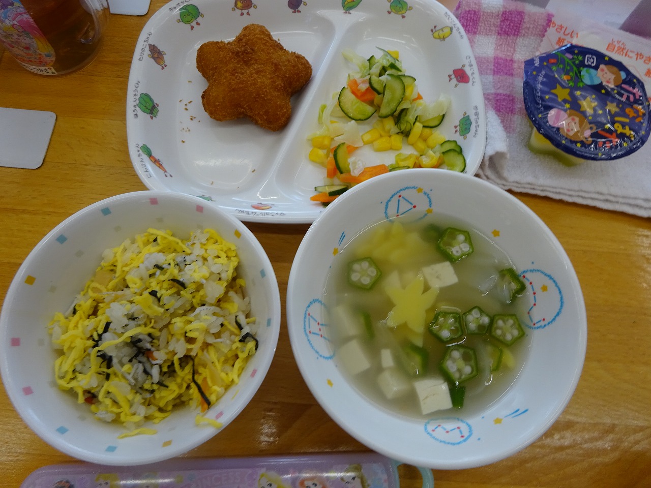7月7日(木)給食 ・ちらし寿司(米・卵・しらす干し・きざみのり) ・星のコロッケ ・フレンチサラダ(キャベツ・きゅうり・にんじん) ・天の川スープ(豆腐・オクラ・マロニー・かまぼこ・にんじん) ・七夕お星さまゼリー