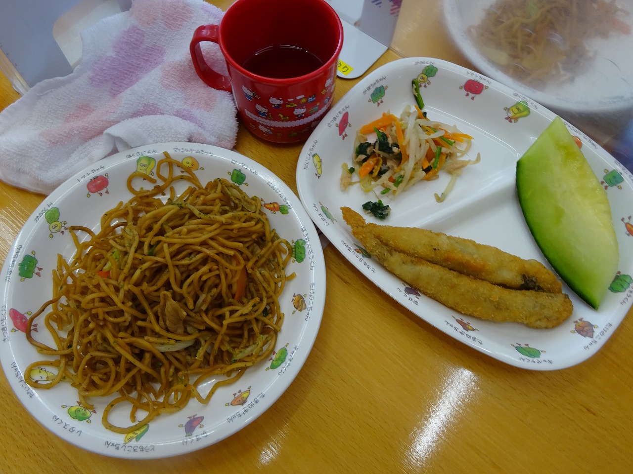 7月8日(金)給食 ・焼きそば(麺・豚肉・キャベツ・玉ねぎ・にんじん・ピーマン) ・シシャモフライ ・かわりおひたし(ほうれん草・ツナ・キャベツ・にんじん・もやし) ・メロン