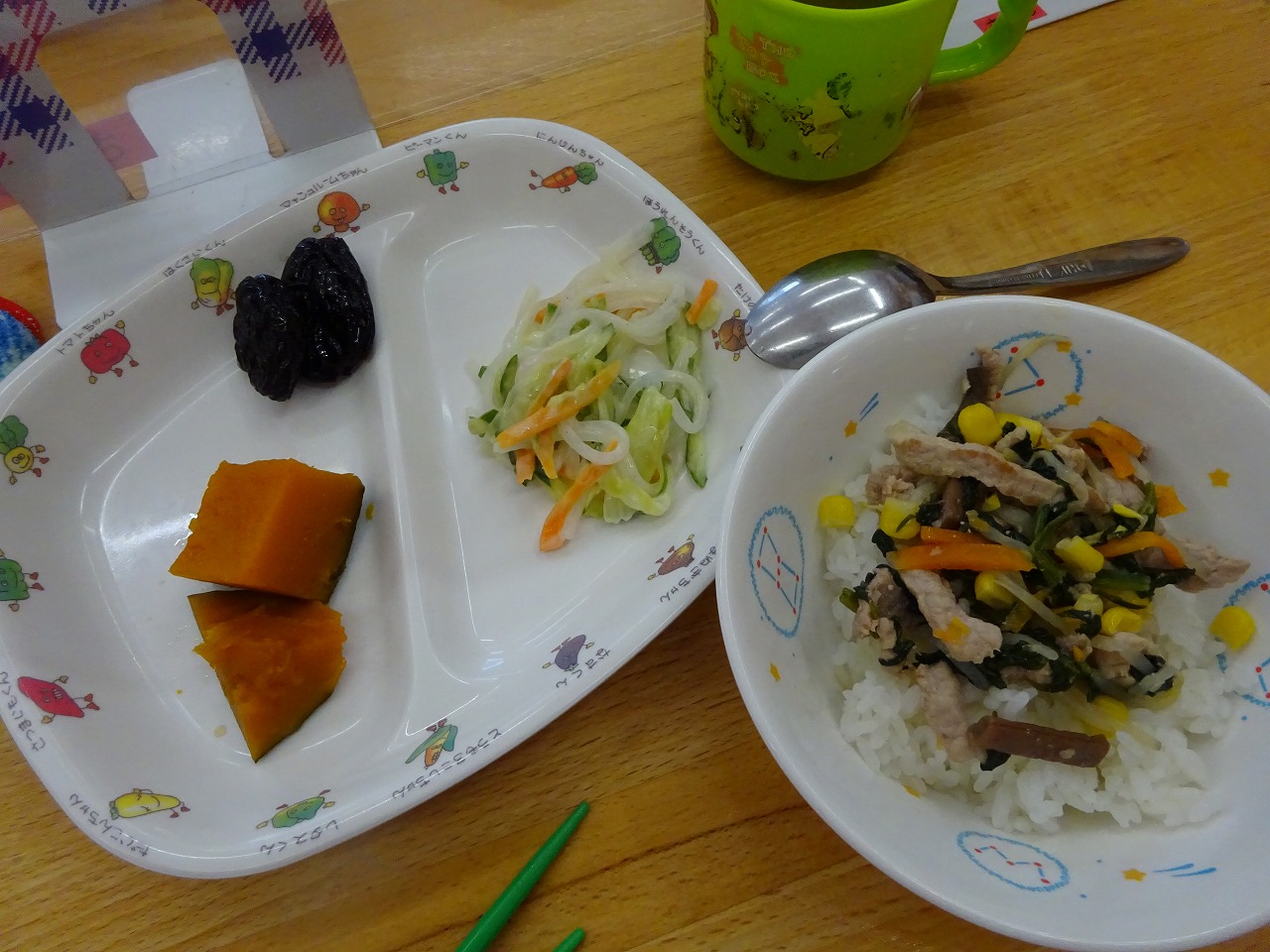 7月11日(月)給食 ・ビビンバ(米・豚肉・もやし・にんじん・ほうれん草・コーン) ・シルバーサラダ(マロニー・キャベツ・きゅうり・にんじん・マヨドレ) ・かぼちゃ甘煮 ・プルーン