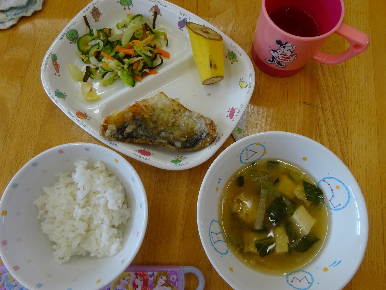 7月13日(水)給食 ・ごはん ・さわらのエスカベッシュ(さわら・玉ねぎ・トマト・パセリ) ・塩昆布あえ(キャベツ・きゅうり・にんじん・塩昆布) ・みそ汁(豆腐・油揚げ・だいこん・こまつな・ねぎ) ・バナナ