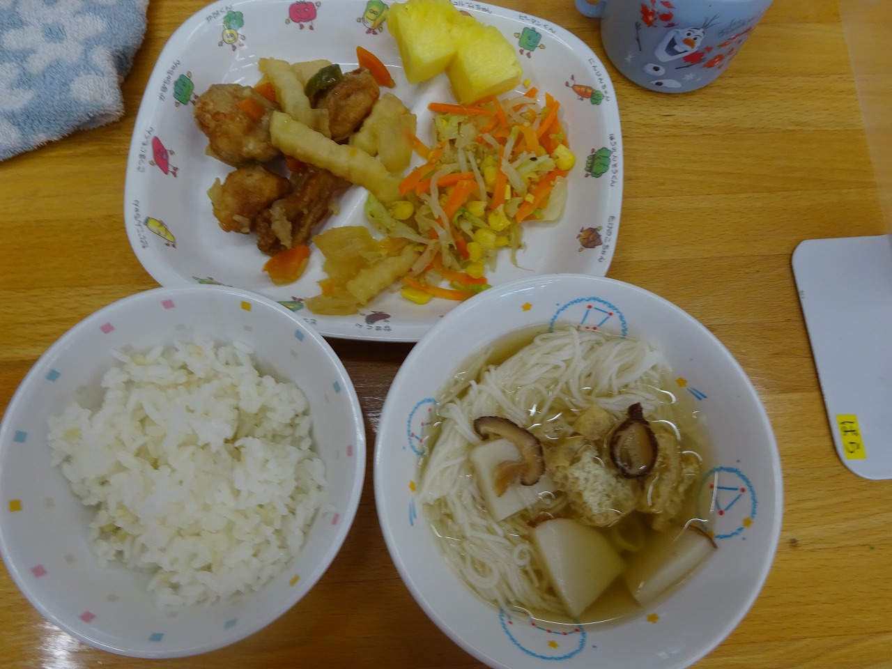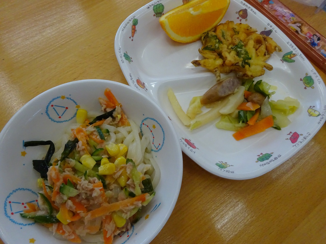 7月19日(火)給食 ・サラダうどん(めん・ツナ・きゅうり・にんじん・コーン・わかめ) ・いろどりソテー(ウインナー・キャベツ・にんじん・玉ねぎ・ピーマン・ポテト) ・野菜かき揚げ ・オレンジ