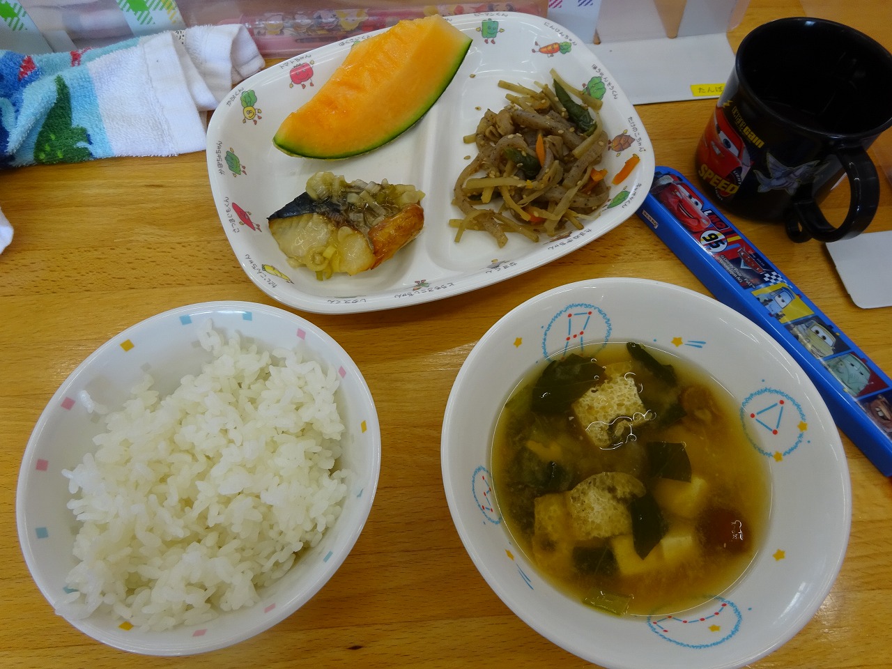7月20日(水)給食 ・ごはん ・さばの香味焼き(さば・ねぎ・生姜) ・五目きんぴら(ごぼう・にんじん・鶏肉・こんにゃく・さやえんどう) ・みそ汁(豆腐・油揚げ・こまつな・玉ねぎ・なめこ) ・メロン