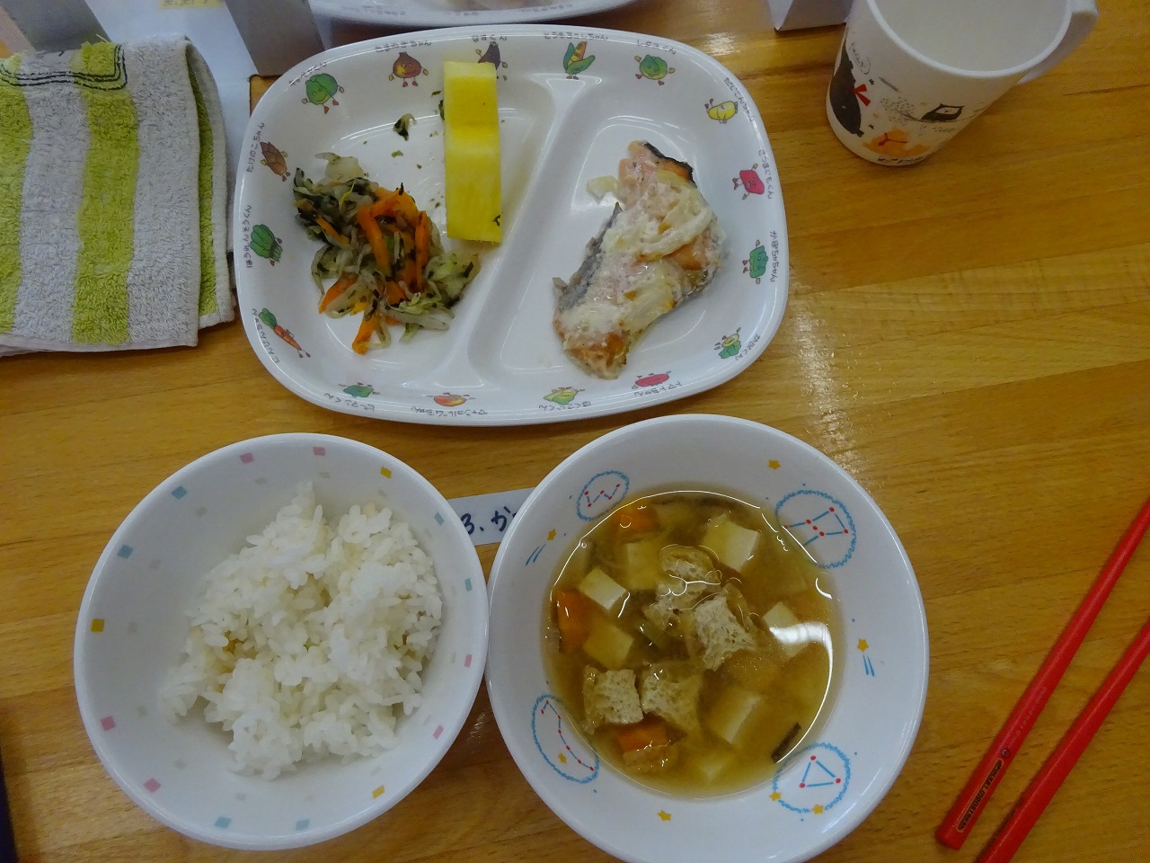 7月26日(火)給食 ・ごはん ・鮭のマヨドレ焼き(さけ・玉ねぎ・マヨドレ) ・いそかあえ(ほうれん草・キャベツ・もやし・にんじん・のり) ・みそ汁(豆腐・油揚げ・だいこん・にんじん・しいたけ・ねぎ・みそ) ・パイナップル