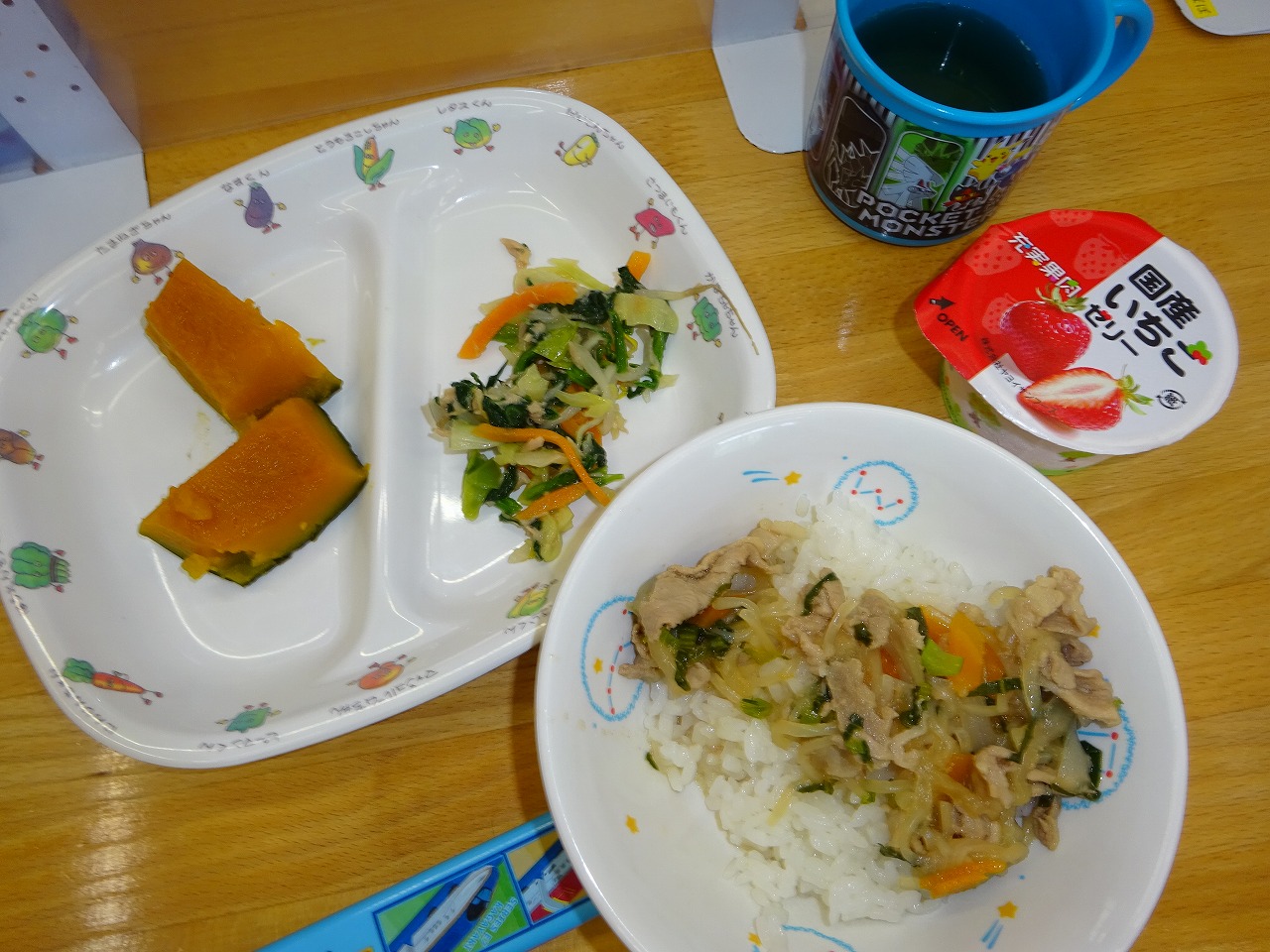 4月25日(月)給食 ・豚どんぶり(米・豚肉・玉ねぎ・にんじん・しめじ・しらたき) ・かわりおひたし(ほうれん草・ツナ・キャベツ・もやし・にんじん) ・かぼちゃの甘煮 ・いちごゼリー