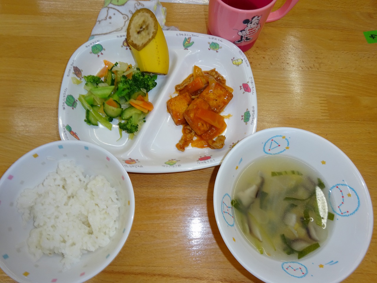 4月26日(火)給食 ・ごはん ・厚揚げのケチャップ煮(厚揚げ・豚肉・玉ねぎ・にんじん・ケチャップ) ・ブロッコリーサラダ(ブロッコリー・キャベツ・きゅうり・にんじん) ・はるさめスープ(マロニー・チンゲン菜・しいたけ・コーン・ねぎ) ・バナナ