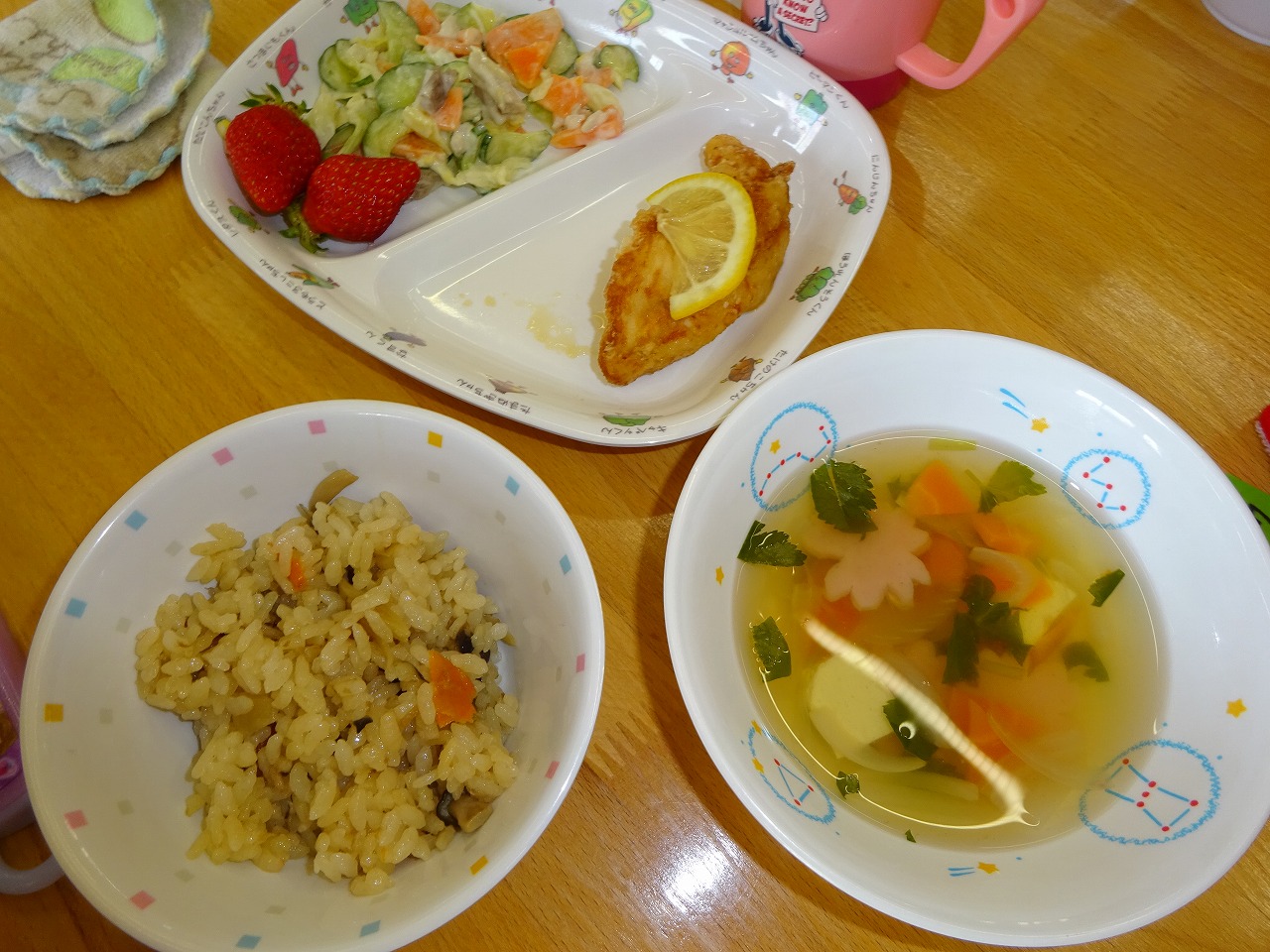 4月27日(水)給食 ・味ごはん ・ささみのレモン煮 ・ハムサラダ(ハム・キャベツ・きゅうり・にんじん・コーン) ・すまし汁(豆腐・かまぼこ・玉ねぎ・にんじん・みつば) ・いちご