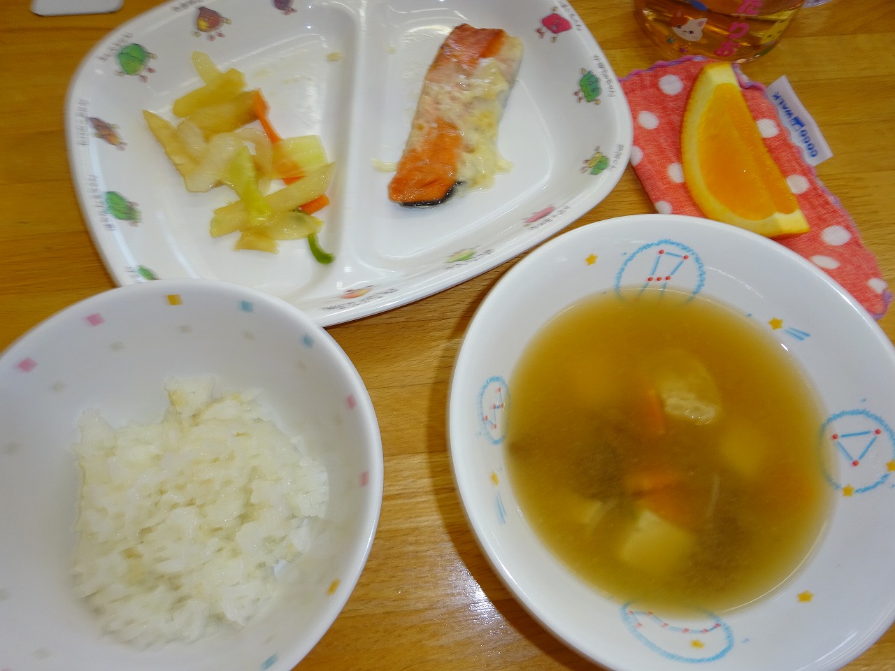 4月28日(木)給食 ・ごはん ・鮭のマヨ焼き(鮭・玉ねぎ・マヨドレ) ・いろどりソテー(ウインナー・ポテト・キャベツ・玉ねぎ・にんじん・ピーマン) ・みそ汁(豆腐・油揚げ・なめこ・にんじん・ねぎ) ・オレンジ