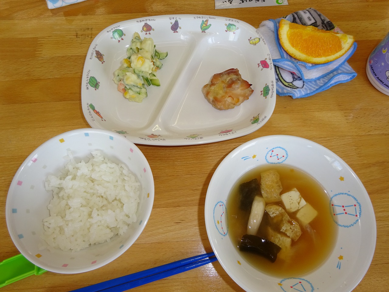5月2日(月)給食 ・ごはん ・鶏肉のマーマレード焼き ・ポテトサラダ(じゃがいも・ハム・きゅうり・にんじん・マヨ) ・みそ汁(豆腐・油揚げ・玉ねぎ・しめじ・わかめ) ・オレンジ