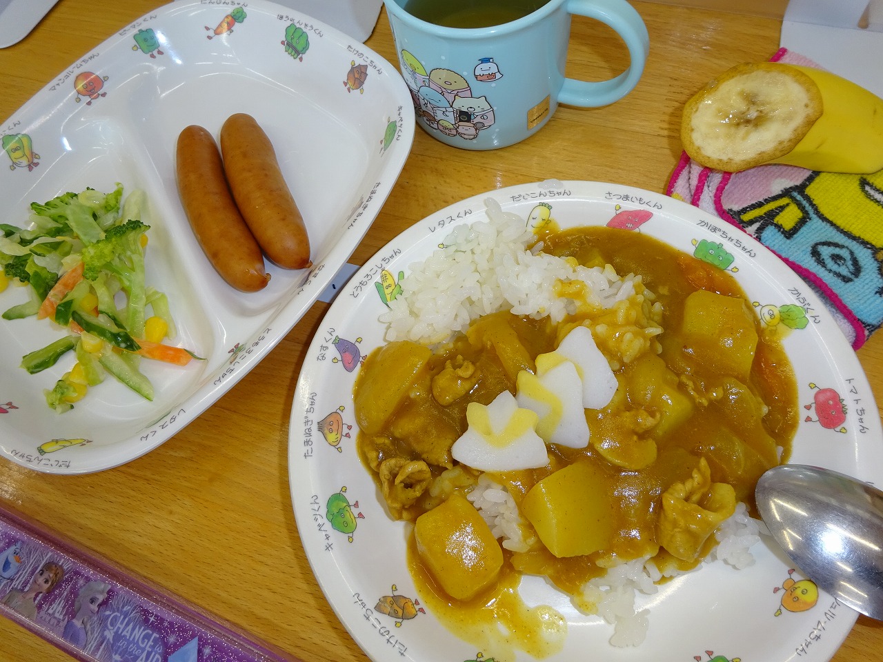 5月6日(金)給食 ・カレーライス(米・豚肉・じゃがいも・玉ねぎ・にんじん・かまぼこ) ・コールスローサラダ(キャベツ・ブロッコリー・きゅうり・にんじん・コーン) ・ウインナー ・バナナ