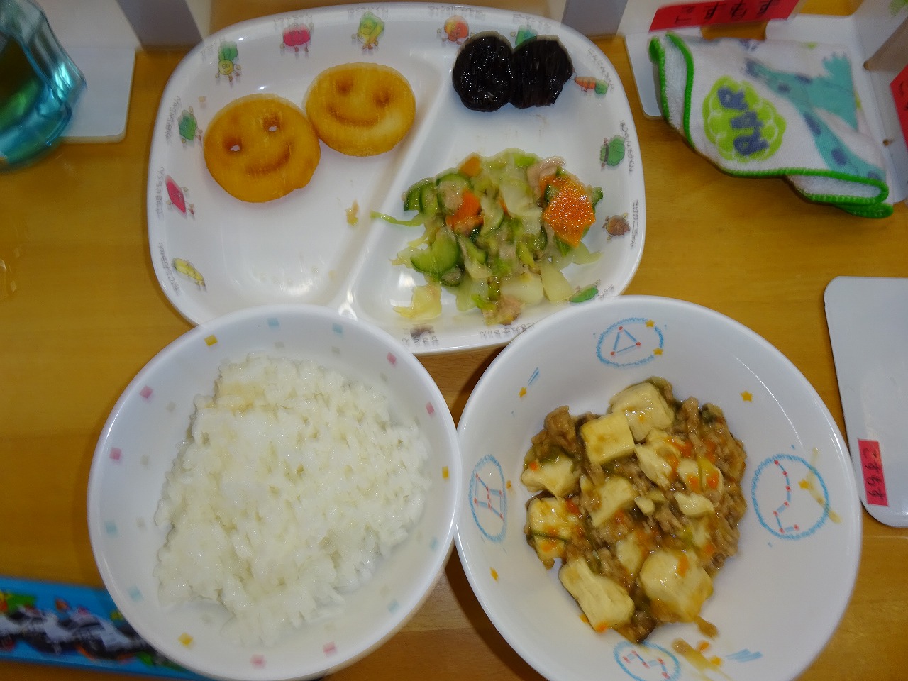 5月9日(月)給食 ・ごはん ・マーボー豆腐(豆腐・豚ひき肉・ねぎ・にんじん・みそ) ・ツナサラダ(ツナ・キャベツ・きゅうり・にんじん) ・スマイルポテト ・プルーン