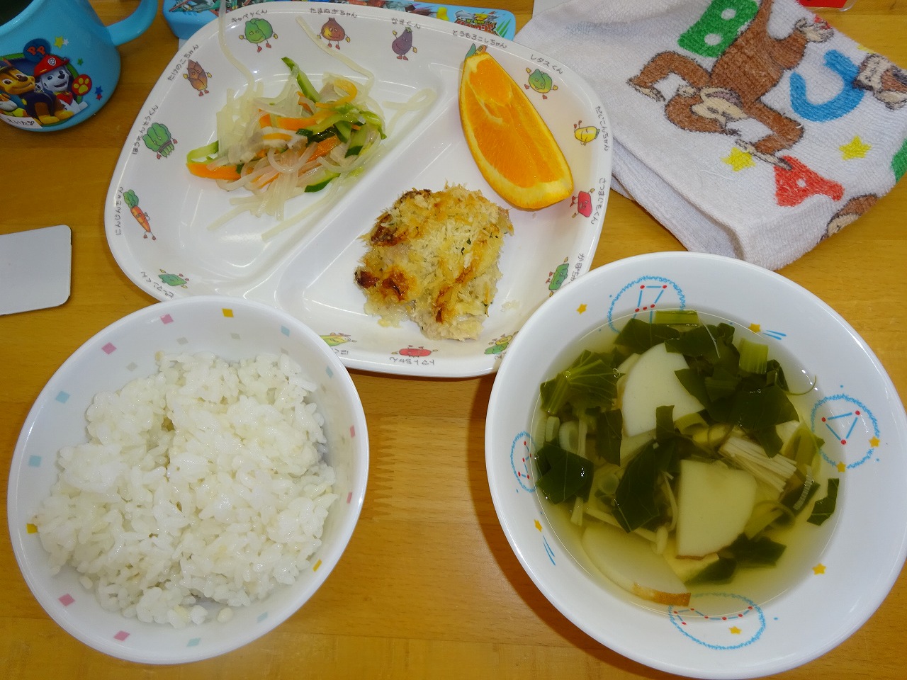 5月10日(火)給食 ・ごはん ・鶏肉のパン粉焼き(鶏肉・パン粉・パセリ・マヨドレ) ・春雨サラダ(マロニー・キャベツ・きゅうり・にんじん・ハム) ・すまし汁(豆腐・かまぼこ・こまつな・えのきたけ・ねぎ) ・オレンジ