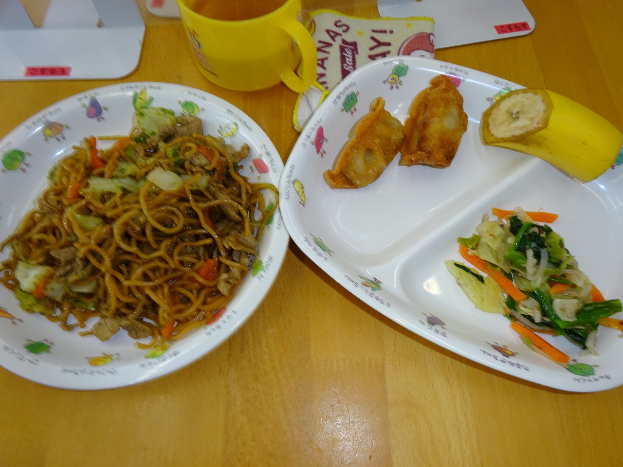 5月13日(金)給食 ・焼きそば(中華めん・豚肉・キャベツ・玉ねぎ・にんじん・ピーマン) ・ほうれん草おひたし(ほうれん草・キャベツ・もやし・にんじん・かつお節) ・揚げギョウザ ・バナナ