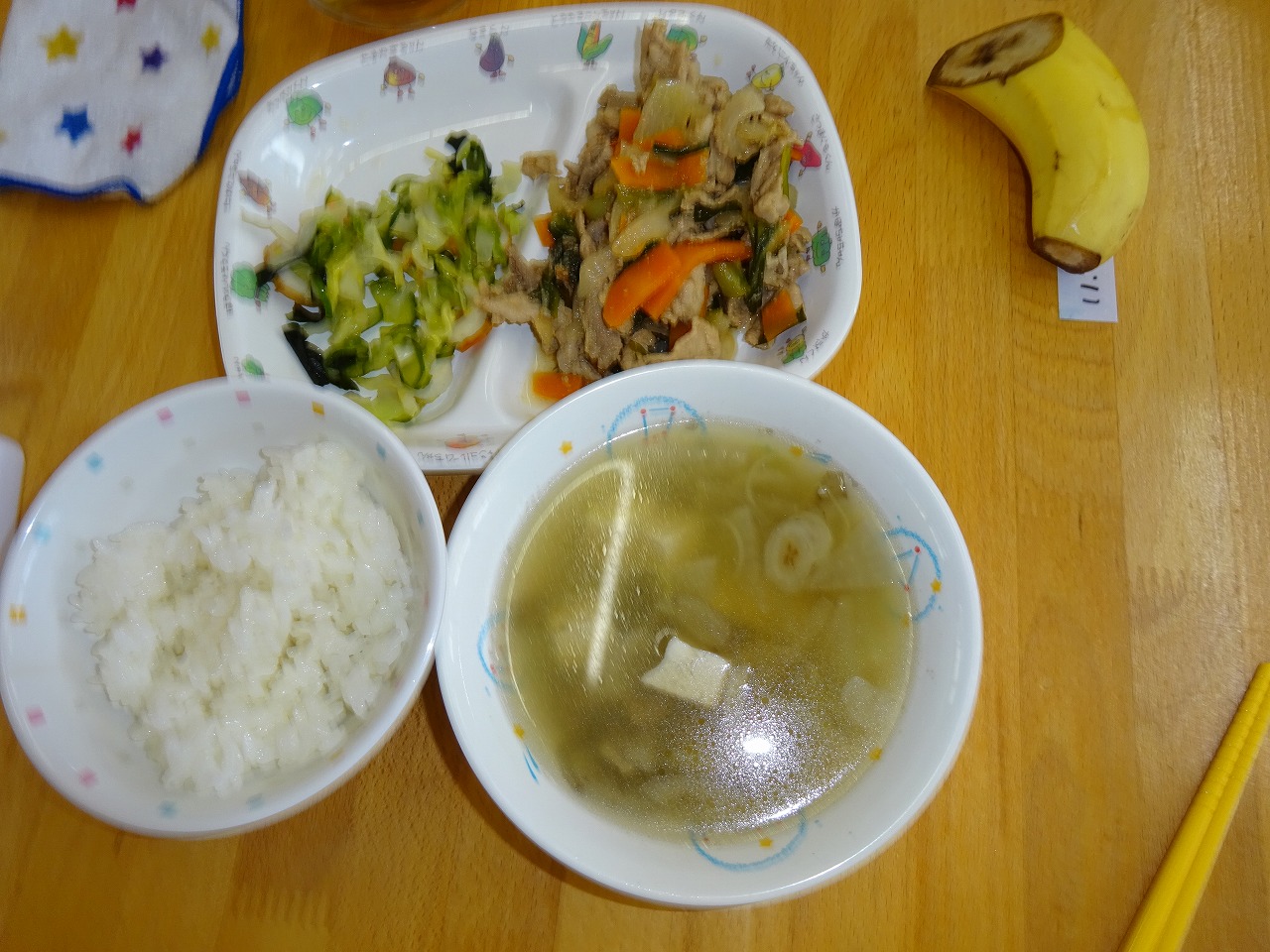 5月17日(火)給食 と おやつ ・ごはん ・豚肉のみそ炒め(豚肉・チンゲン菜・玉ねぎ・にんじん・にら・みそ) ・きゅうりの酢の物(きゅうり・キャベツ・にんじん・ちくわ・わかめ) ・五目汁(鶏肉・豆腐・だいこん・ごぼう・ねぎ) ・バナナ 今日のおやつは、『あねかえし』 農産加工センターで作ってもらい、購入しました。