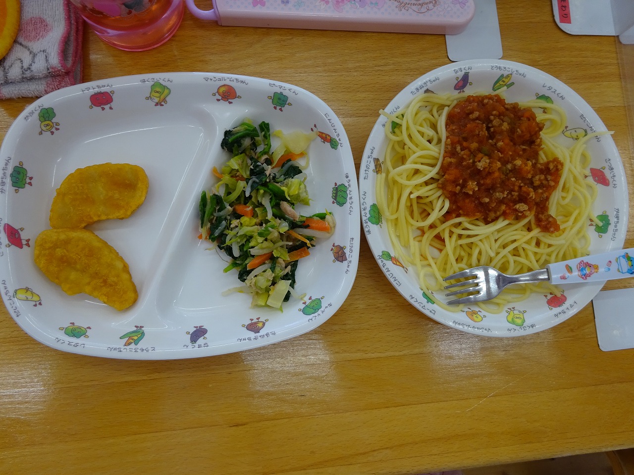 3月16日(水)給食 ・ミートスパゲティ(パスタ・豚挽肉・玉ねぎ・にんじn・ピーマン・マッシュルーム) ・かわりおひたし(ほうれん草・キャベツ・にんじん・もやし・ツナ) ・チキンナゲット ・パイナップル