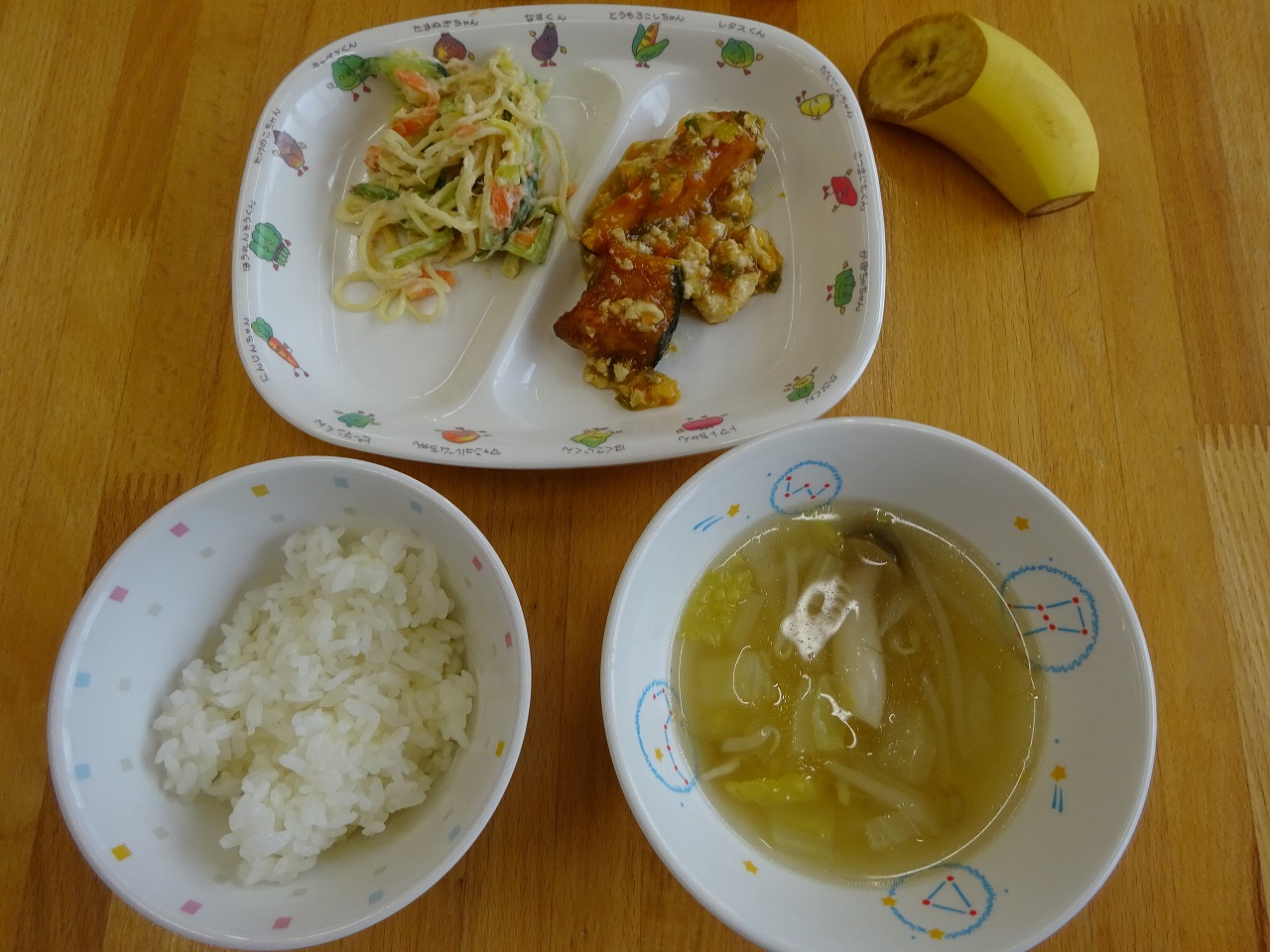 3月18日(金)給食 ・ごはん ・かぼちゃのそぼろあんかけ(かぼちゃ・鶏挽肉・玉ねぎ・にんじん・ピーマン) ・スパサラダ(サラスパ・ツナ・キャベツ・きゅうり・にんじん) ・白菜スープ(白菜・ベーコン・玉ねぎ・もやし・しめじ) ・バナナ