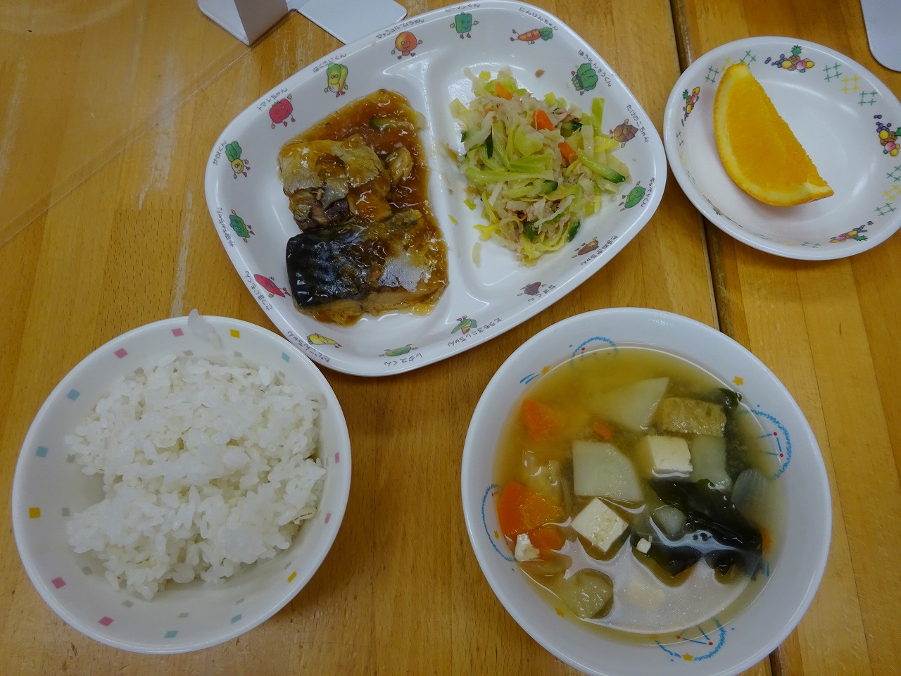 3月22日(火)給食 ・ごはん ・さばのみそ煮 ・切干大根サラダ(切干大根・きゅうり・にんじん・キャベツ・ツナ) ・みそ汁(豆腐・油揚げ・じゃがいも・玉ねぎ・にんじん・わかめ) ・オレンジ