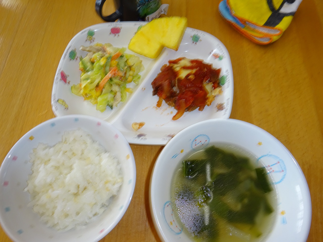 3月23日(水)給食 ・ごはん ・煮込みハンバーグ(ハンバーグ・玉ねぎ・にんじん) ・コールスローサラダ(キャベツ・きゅうり・にんじん・ハム・コーン) ・ABCスープ(マカロニ・玉ねぎ・小松菜・しめじ) ・パイナップル