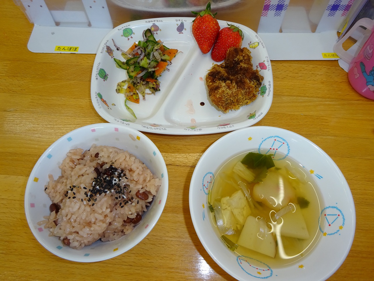 3月24日(木)給食 ・赤飯 ・ひれカツ(豚肉・卵・パン粉) ・ゆかりあえ(キャベツ・きゅうり・にんじん・ゆかり) ・すまし汁(豆腐・かまぼこ・えのきたけ・玉ねぎ・みつば) ・いちご