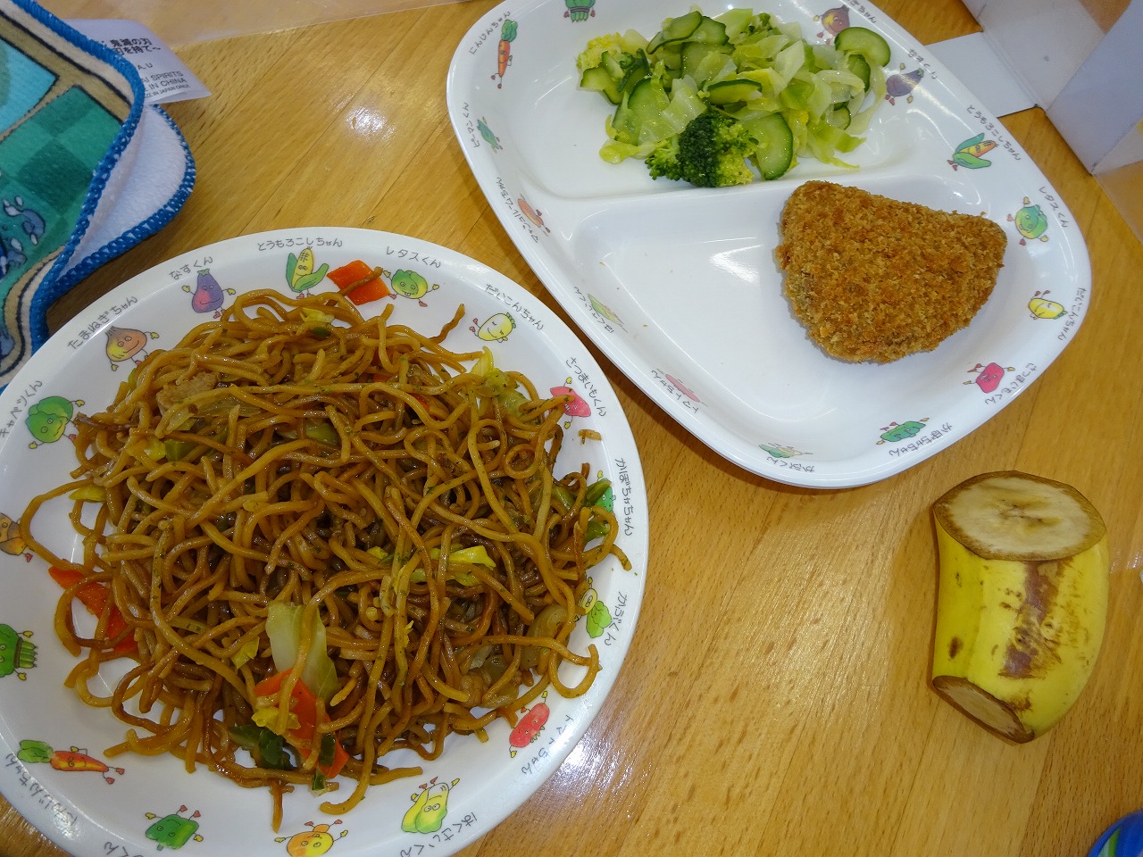 3月25日(金) 給食 ・焼きそば(麺・豚肉・キャベツ・玉ねぎ・にんじん・ピーマン) ・グリーンサラダ(ブロッコリー・キャベツ・きゅうり) ・かぼちゃ挽肉フライ ・バナナ