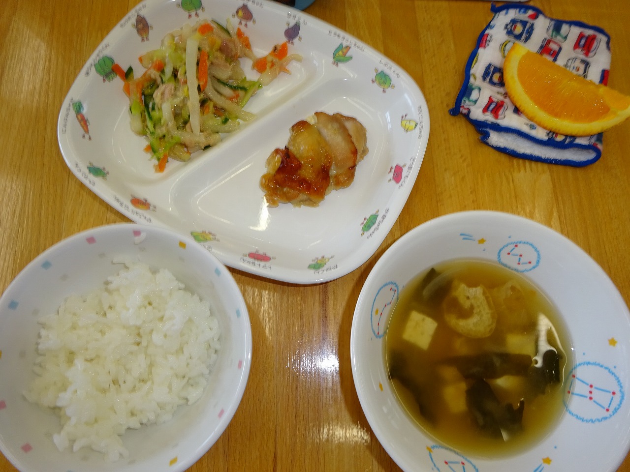 4月6日(水)給食 ・ごはん ・鶏肉の香味焼き ・だいこんサラダ(だいこん・ツナ・キャベツ・きゅうり・にんじん) ・みそ汁(豆腐・油揚げ・玉ねぎ・しめじ・わかめ) ・オレンジ