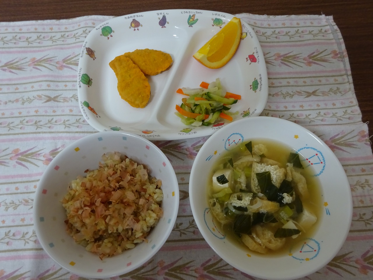 6月17日(月)給食 ・おかかチャーハン ・チキンナゲット ・胡瓜の酢の物 ・みそ汁 ・オレンジ