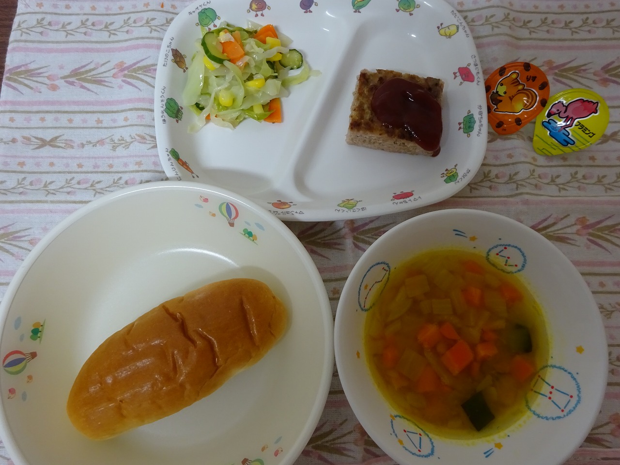 6月18日(火)給食 ・牛乳 ・ロールパン ・ミートローフ ・フレンチサラダ ・南瓜スープ ・ポックンゼリー