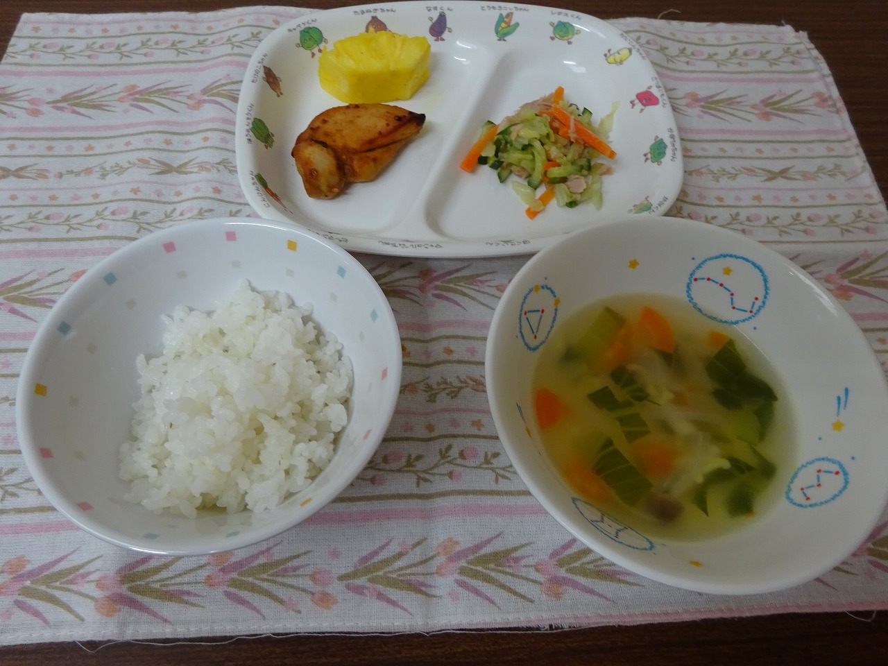 6月19日(水)給食 ・ごはん ・タンドリーチキン ・ツナサラダ ・ABCスープ ・パイナップル