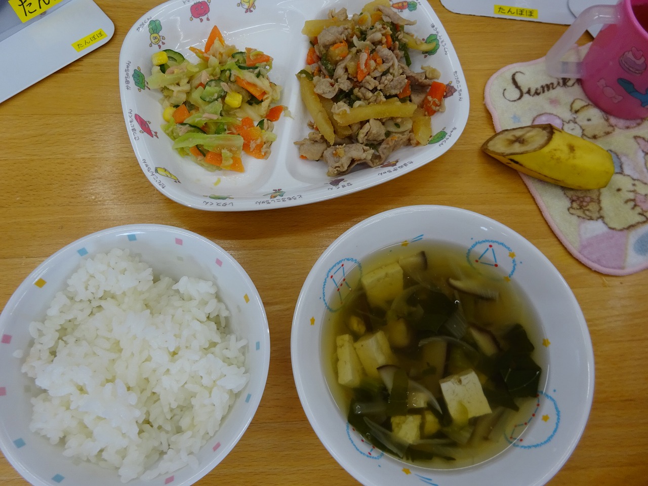 1月18日(火)給食 ・ごはん ・豚肉のピーマンの甘辛炒め(豚肉・ピーマン・にんじん・フライドポテト) ・コーンサラダ(コーン・ツナ・きゅうり・にんじん・キャベツ) ・すまし汁(豆腐・玉ねぎ・小松菜・しいたけ) ・バナナ