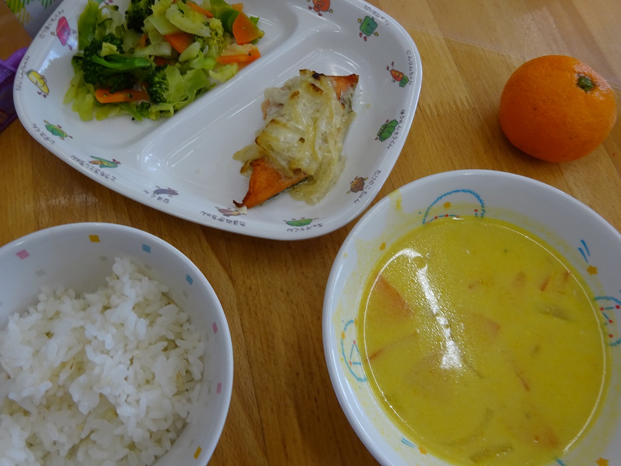 1月19日(水)給食 ・ごはん ・鮭のマヨ焼き(さけ・玉ねぎ・マヨドレ) ・フレンチサラダ(ブロッコリー・きゅうり・キャベツ・にんじん) ・かぼちゃスープ(かぼちゃ・ベーコン・玉ねぎ・にんじん・豆乳) ・みかん