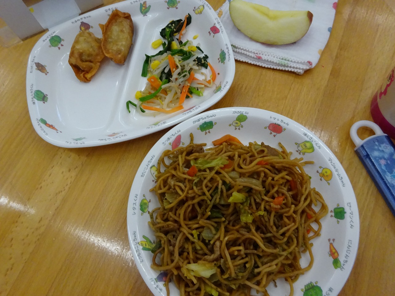 1月20日(木)給食 ・焼きそば(麺・豚肉・キャベツ・にんじん・玉ねぎ・ピーマン) ・ほうれん草ナムル(ほうれん草・にんじん・もやし・コーン) ・揚げギョウザ ・りんご