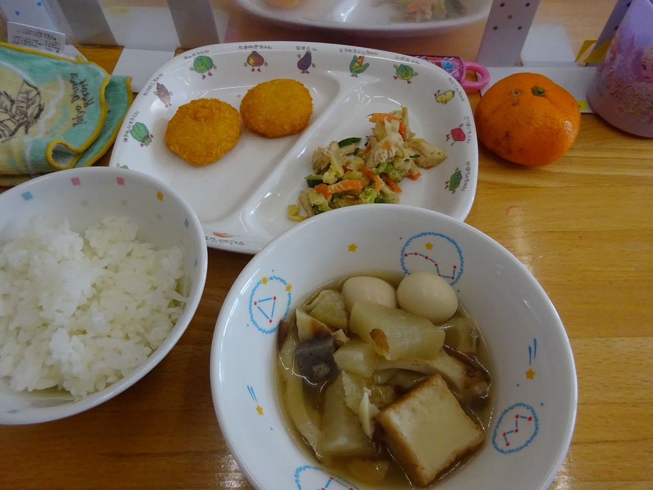 1月24日(月)給食 ・ごはん ・関東煮(だいこん・うずら卵・こんにゃく・ちくわ・厚揚げ) ・バンバンジー(キャベツ・鶏ささみ・きゅうり・にんじん・ごま) ・ホタテ風フライ ・みかん