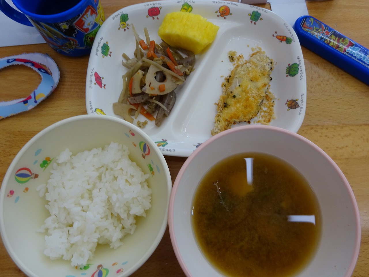 1月27日(水)給食 ・ごはん ・たらのパン粉焼き(たら・パン粉・パセリ・マヨドレ) ・五目きんぴら(ごぼう・にんじん・れんこん・油揚げ・いんげん・こんにゃく・ごま) ・みそ汁(豆腐・だいこん・にんじん・ねぎ・わかめ) ・パイナップル