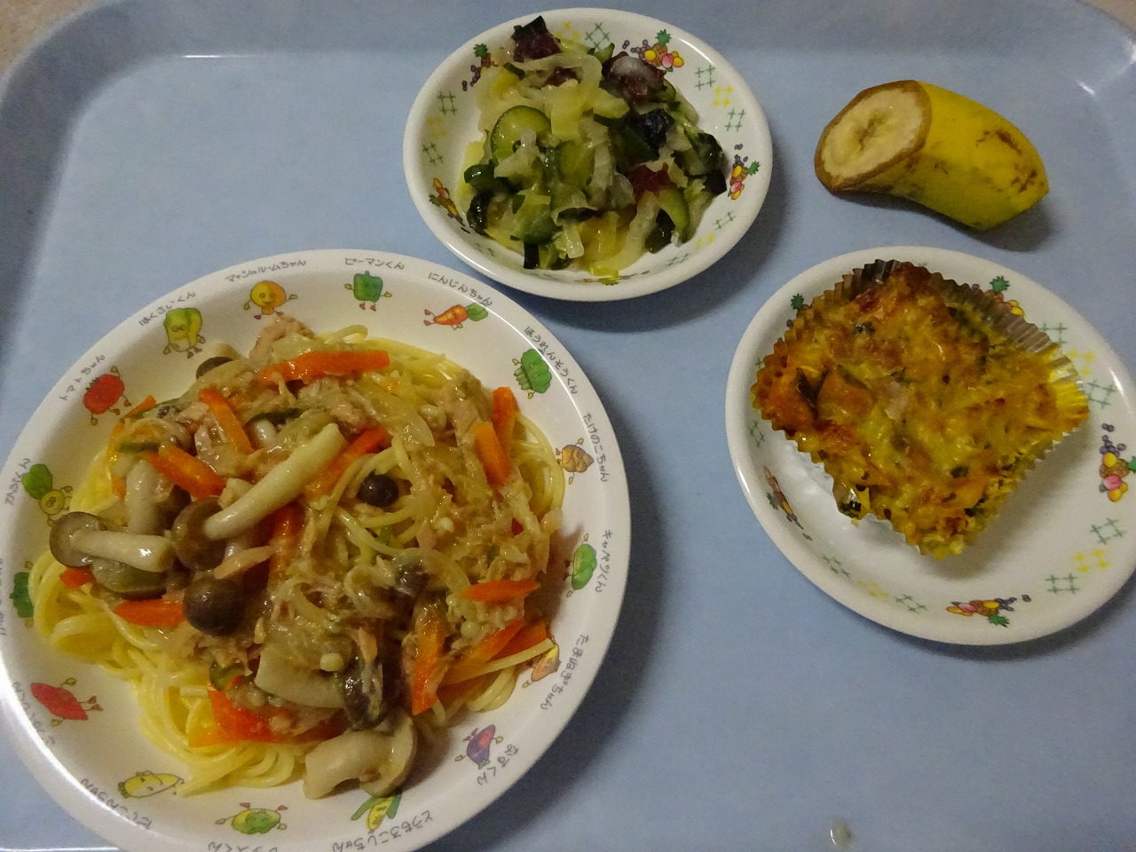 1月28日(金)給食 ・和風スパゲティ(パスタ・ツナ・えのきたけ・しめじ・玉ねぎ・にんじん・ピーマン) ・かぼちゃココット焼き(かぼちゃ・コーン・ベーコン・チーズ・パセリ) ・海藻サラダ(海草・キャベツ・きゅうり・だいこん) ・バナナ ・