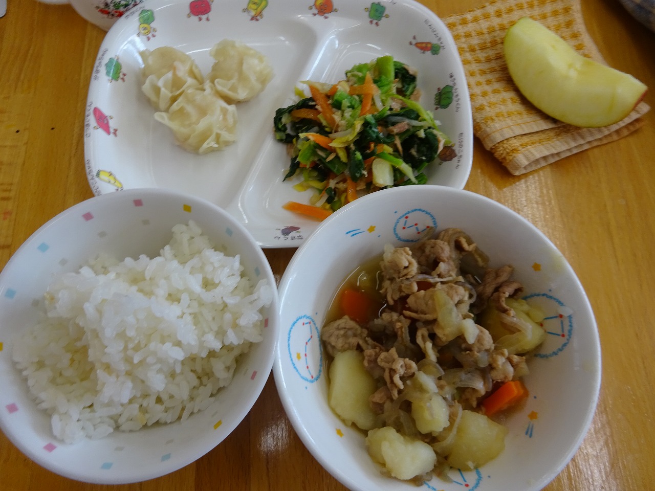1月31日(月)給食 ・ごはん ・肉じゃが(じゃがいも・豚肉・玉ねぎ・にんじん・こんにゃく・いんげん) ・小松菜のサラダ(小松菜・キャベツ・にんじん・もやし・ツナ) ・蒸しエビシューマイ ・りんご