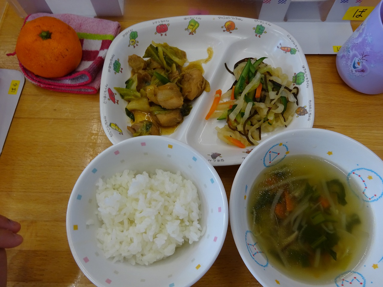 2月1日(火)給食 ・ごはん ・鶏ちゃん風炒め(鶏肉・キャベツ・玉ねぎ・ニラ) ・大根の塩昆布あえ(だいこん・きゅうり・にんじん・塩昆布) ・コンソメスープ(小松菜・にんじん・しいたけ・もやし・ねぎ) ・みかん