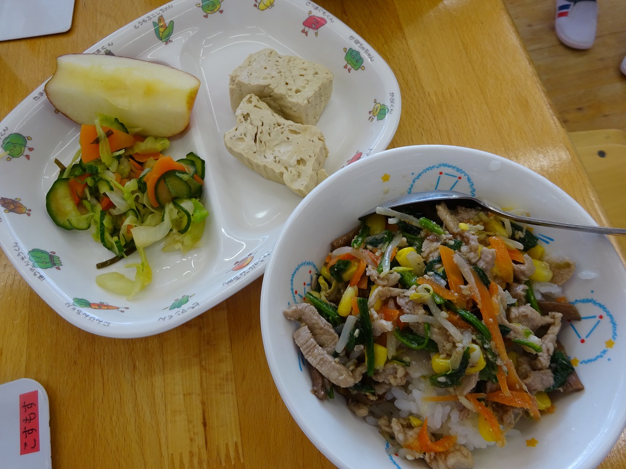 11月15日(月)給食 ・ビビンバ(米・豚肉・もやし・にんじん・ほうれん草・ぜんまい・コーン) ・塩昆布あえ(キャベツ・にんじん・きゅうり・塩昆布) ・こも豆腐の煮物 ・りんご