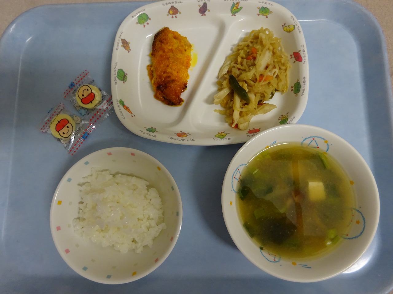 11月10日(水)給食 ・ごはん ・白身魚のレモン風味(たら・レモン) ・チップスサラダ(キャベツ・きゅうり・にんじん・ポテトチップス) ・みそ汁(豆腐・油揚げ・だいこん・小松菜・ねぎ) ・バナナ