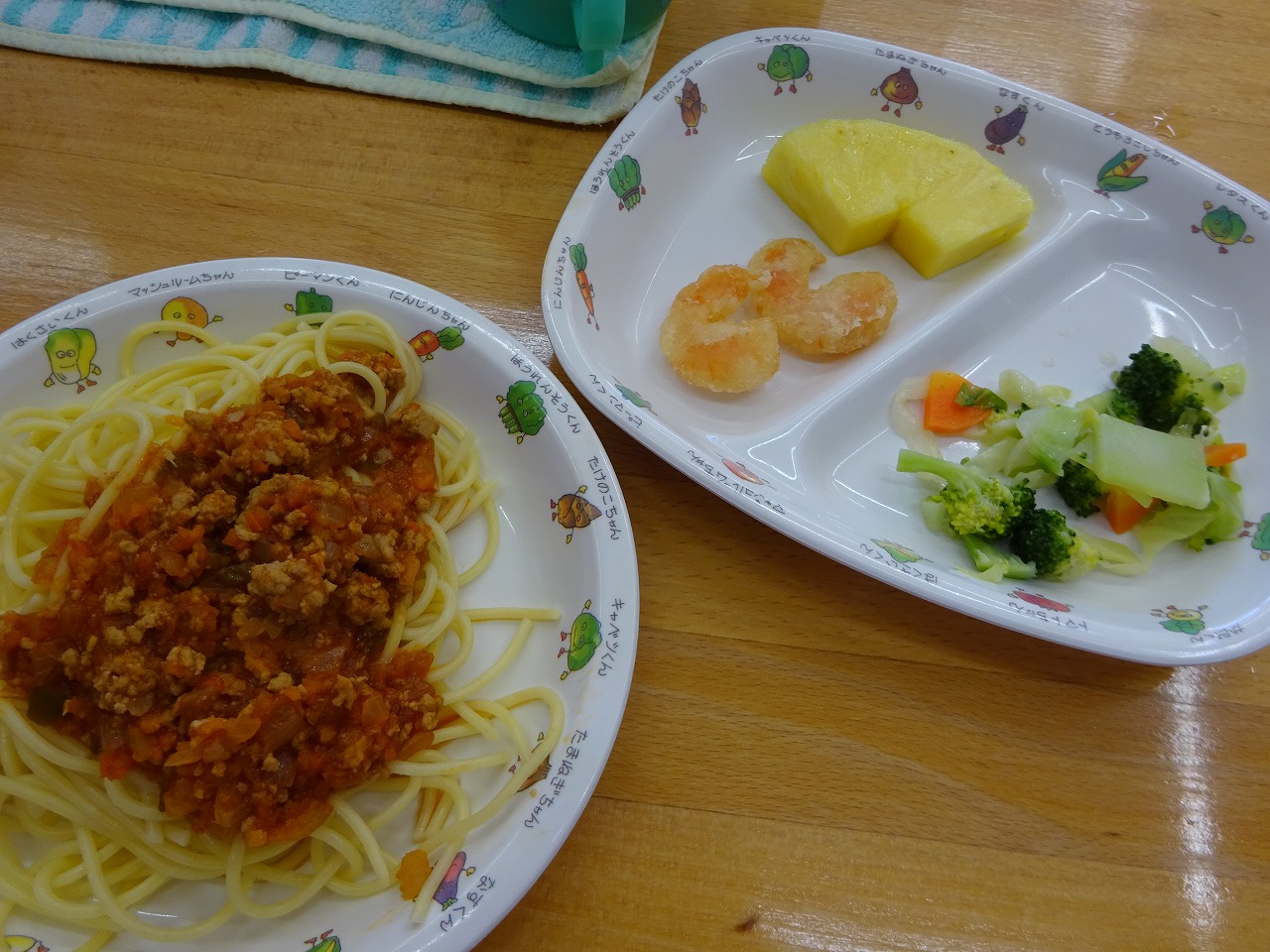 11月17日(水)給食 ・ミートスパゲティ(パスタ・豚ひき肉・玉ねぎ・にんじん・ピーマン・ケチャップ) ・ブロッコリーサラダ(ブロッコリー・キャベツ・きゅうり・にんじん) ・えびフリッター ・パイナップル