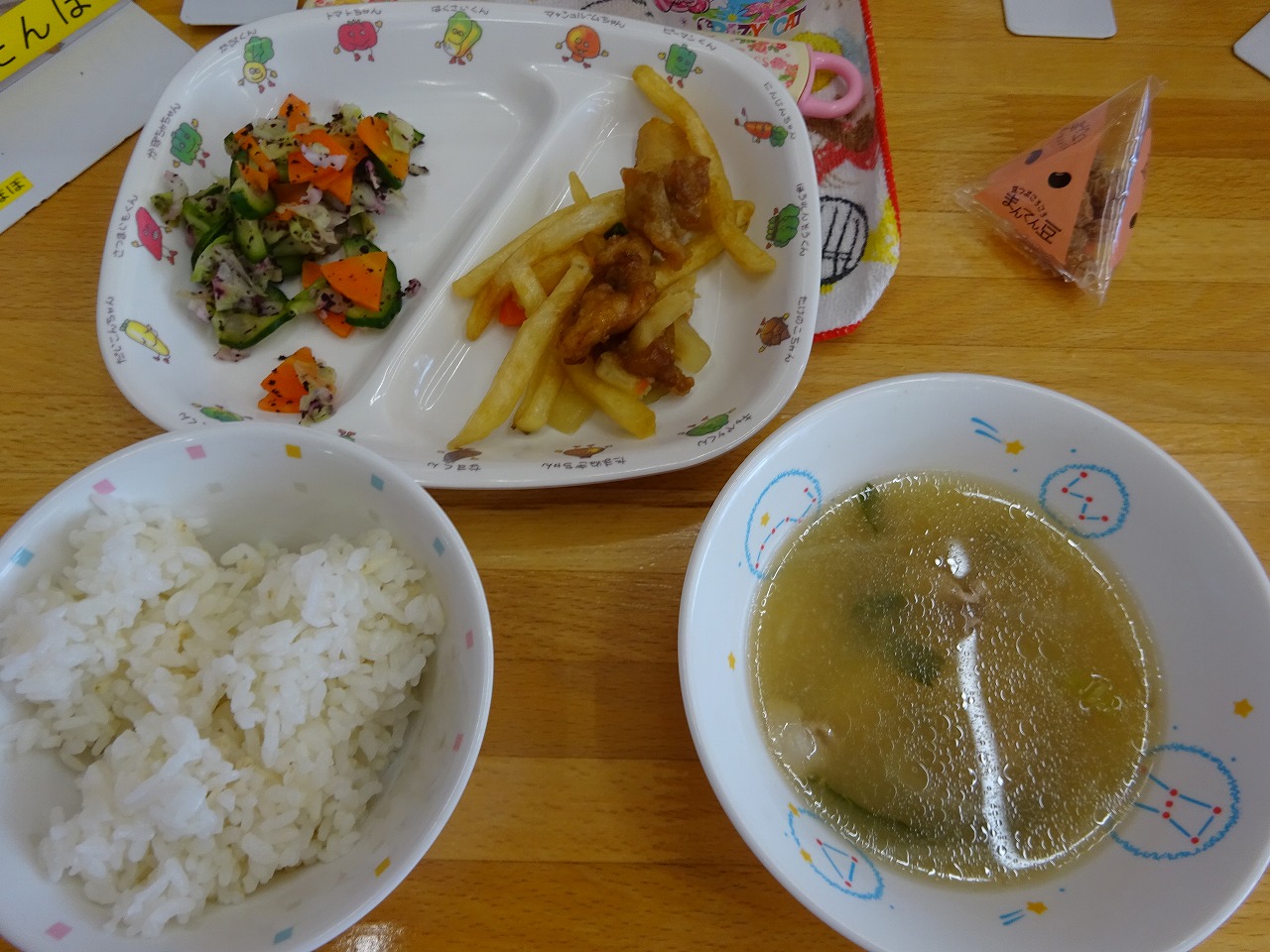 11月18日(木)給食 ・ごはん ・鶏肉とポテトの揚げ煮(鶏肉・ポテト・にんじん・ピーマン・ケチャップ) ・ゆかりあえ(キャベツ・きゅうり・にんじん・ゆかり) ・みそわんたん(豚肉・ワンタン・もやし・ちんげん菜・玉ねぎ・みそ) ・豆つぶころころ(未満児は、プルーン)
