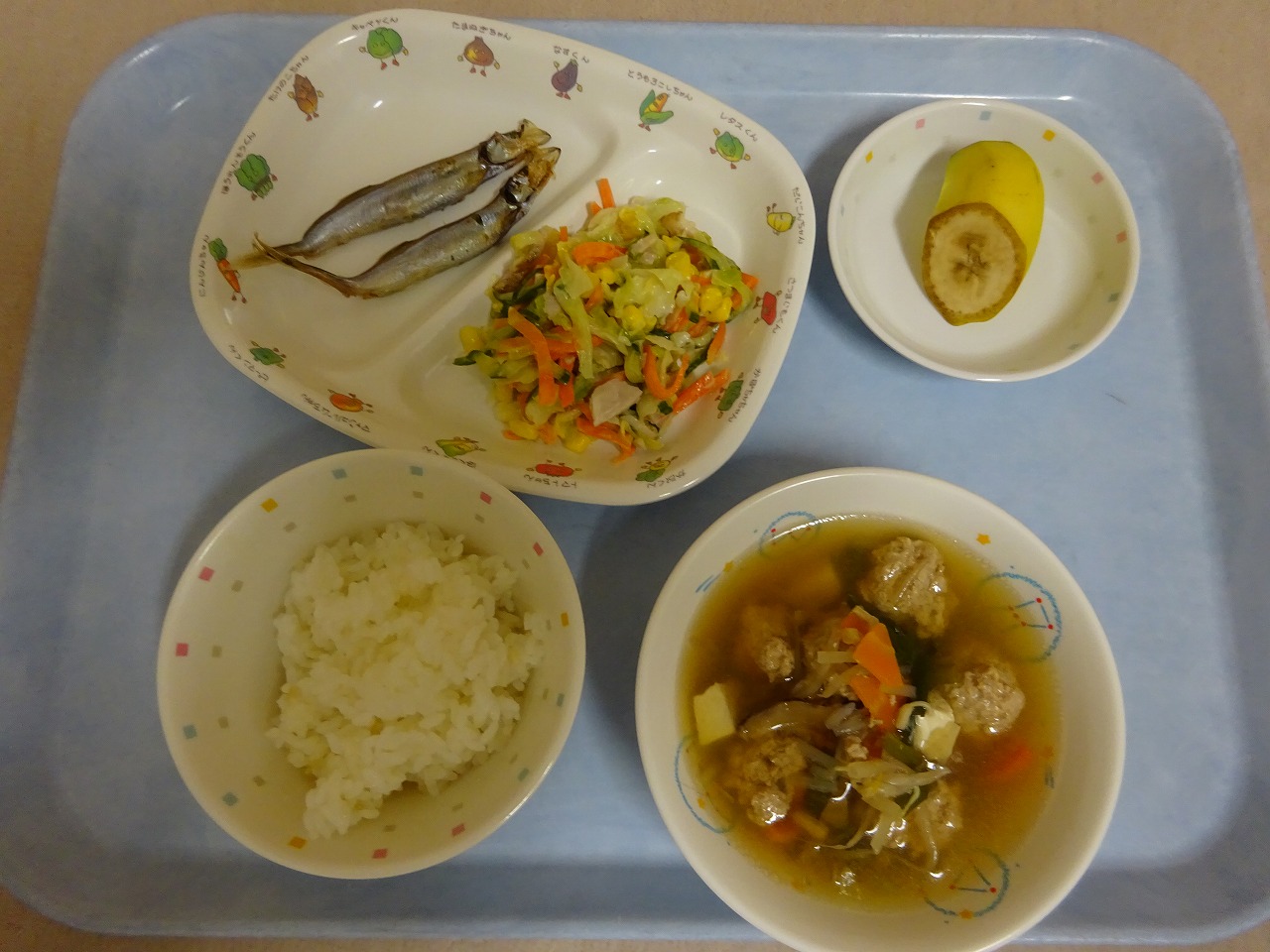11月19日(金)給食 ・ごはん ・焼きししゃも ・コールスローサラダ(キャベツ・きゅうり・にんじん・ハム・コーン・マヨドレ) ・肉団子汁(豚ひき肉・玉ねぎ・ねぎ・にら・もやし・にんじん・豆腐・干ししいたけ) ・バナナ